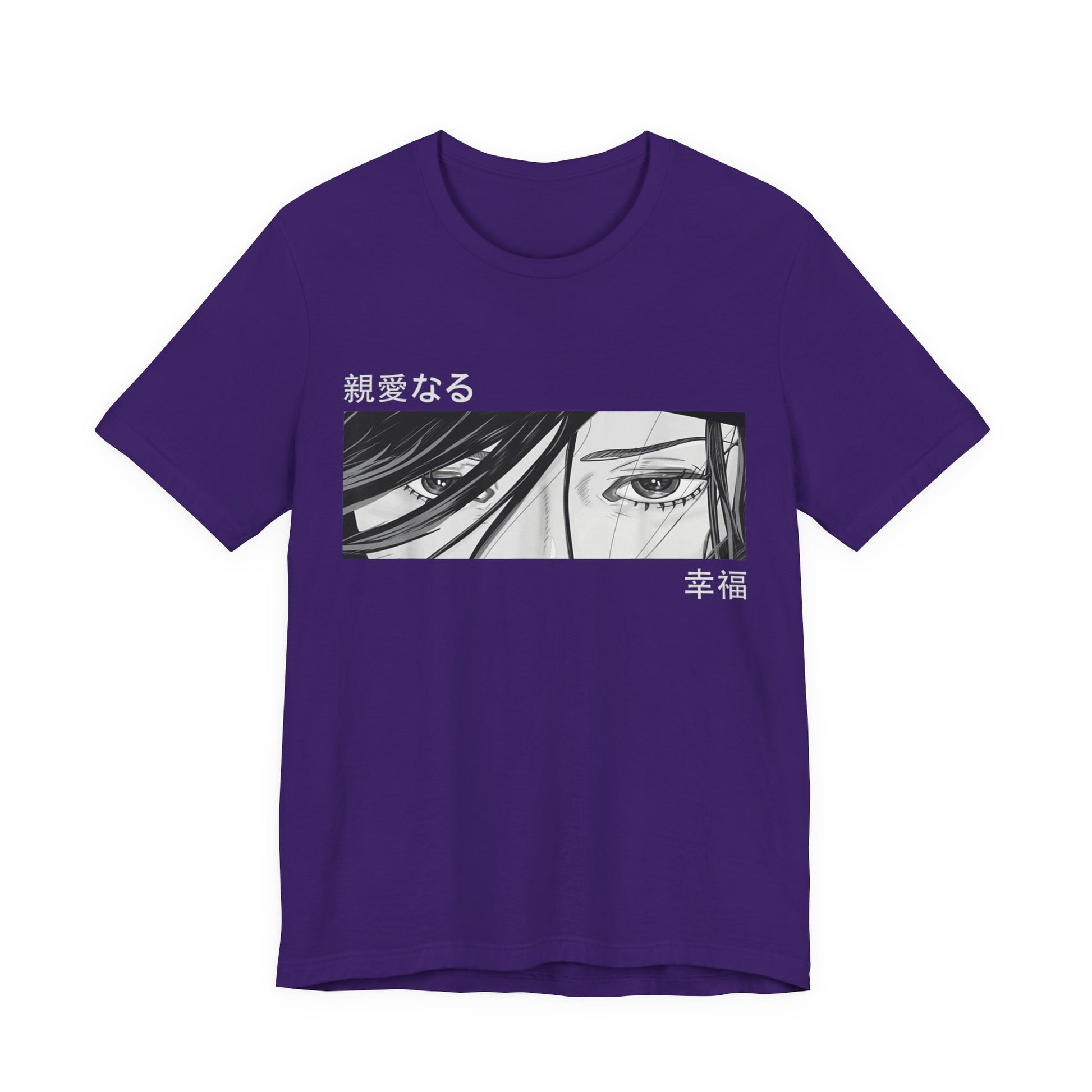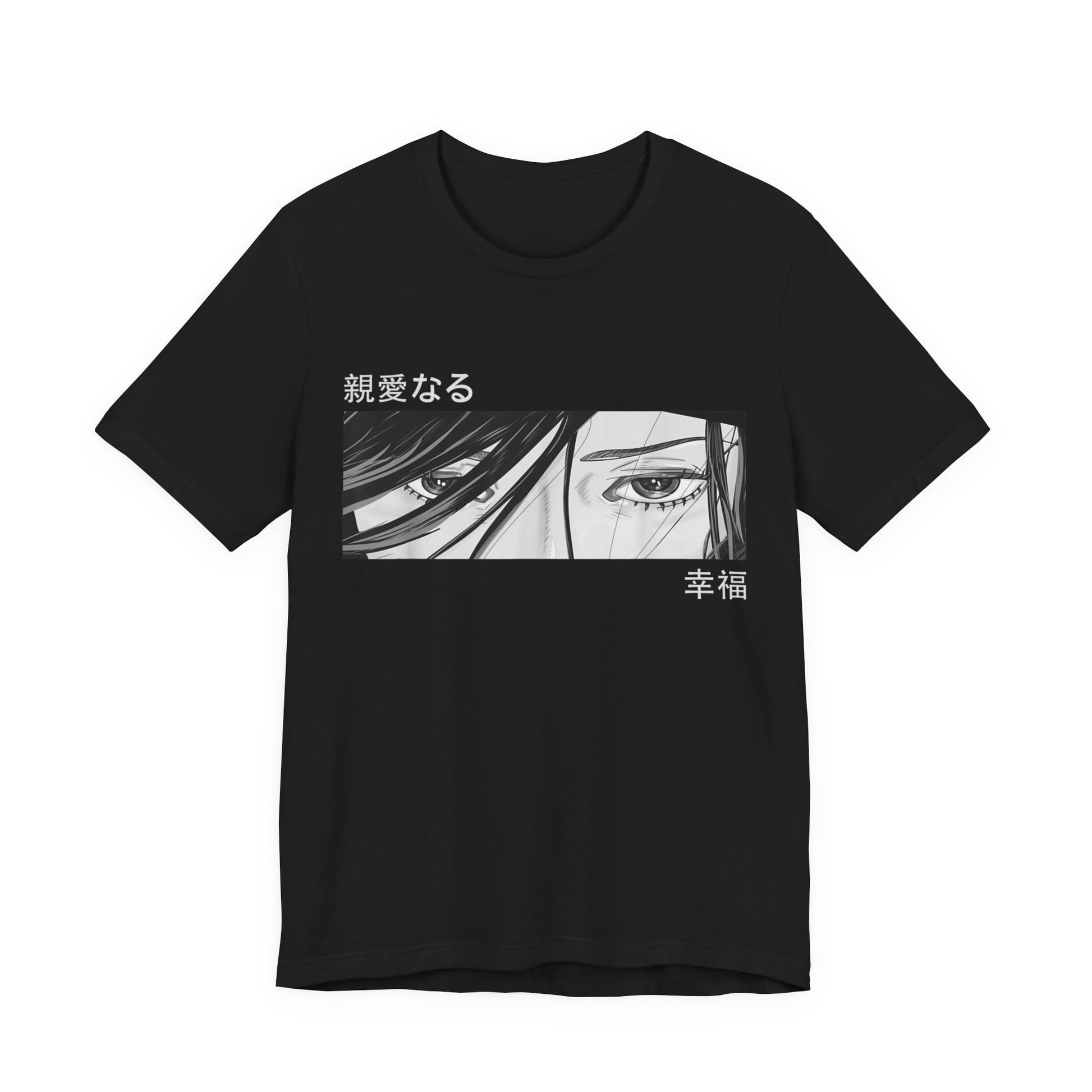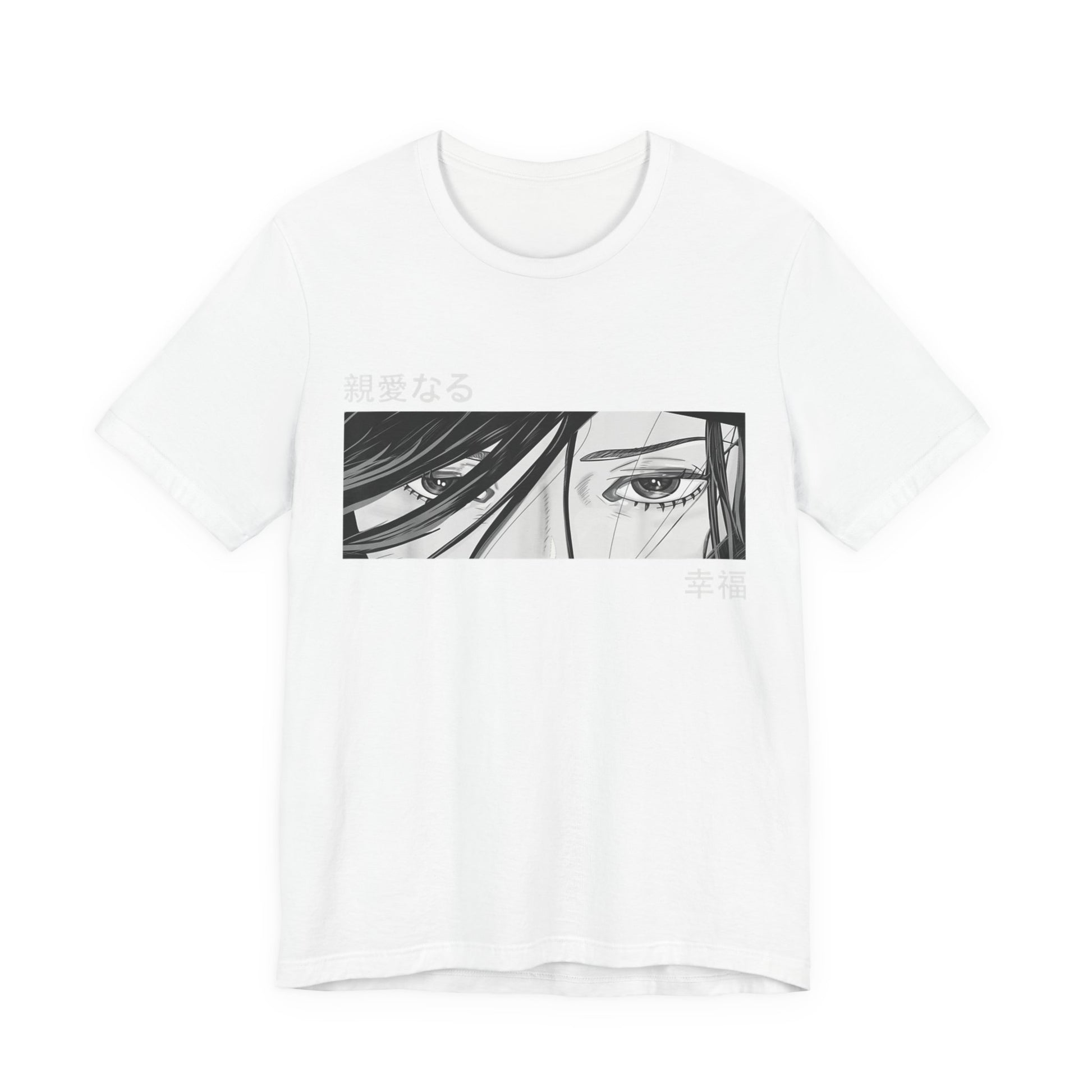 Black and White Anime Girl Eyes Japanese Tee. This classic unisex jersey short sleeve tee fits like a well-loved favorite. Soft cotton and quality print make users fall in love with it over and over again. These otaku t-shirts have-ribbed knit collars to bolster shaping. The shoulders are tapered for a better fit over time. Dual side seams hold the garment's shape for longer.