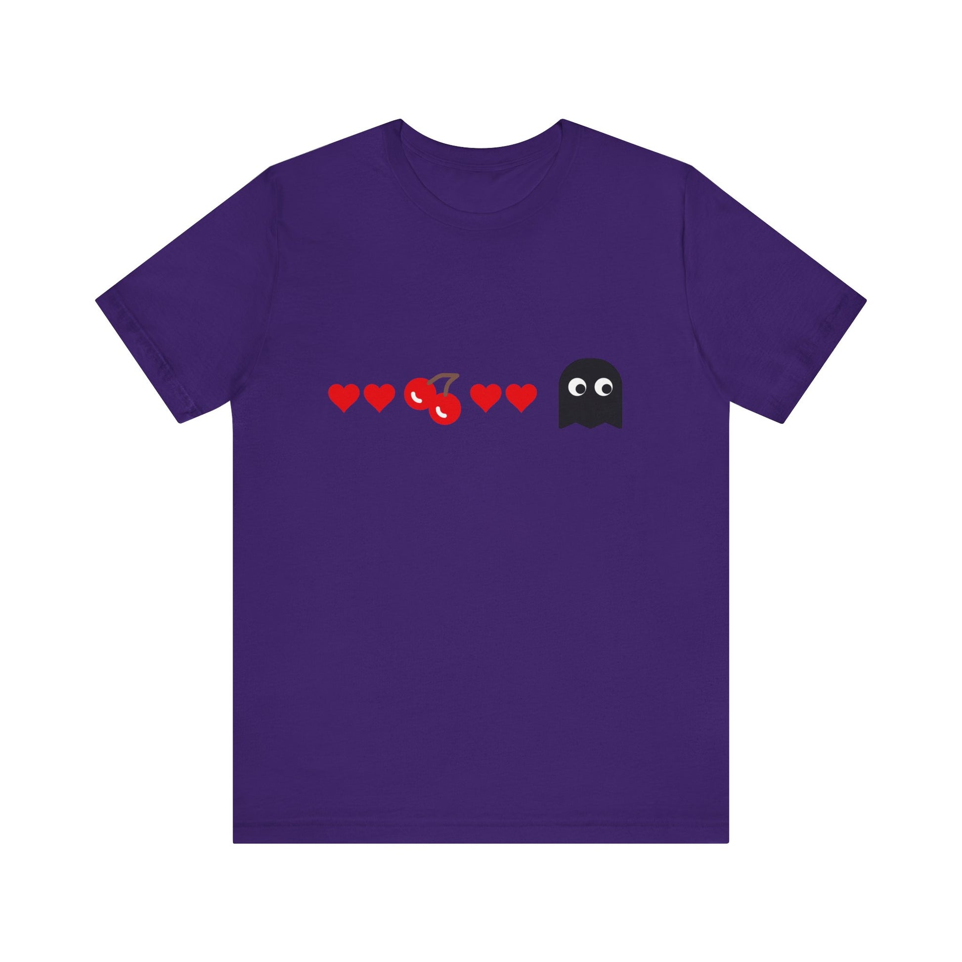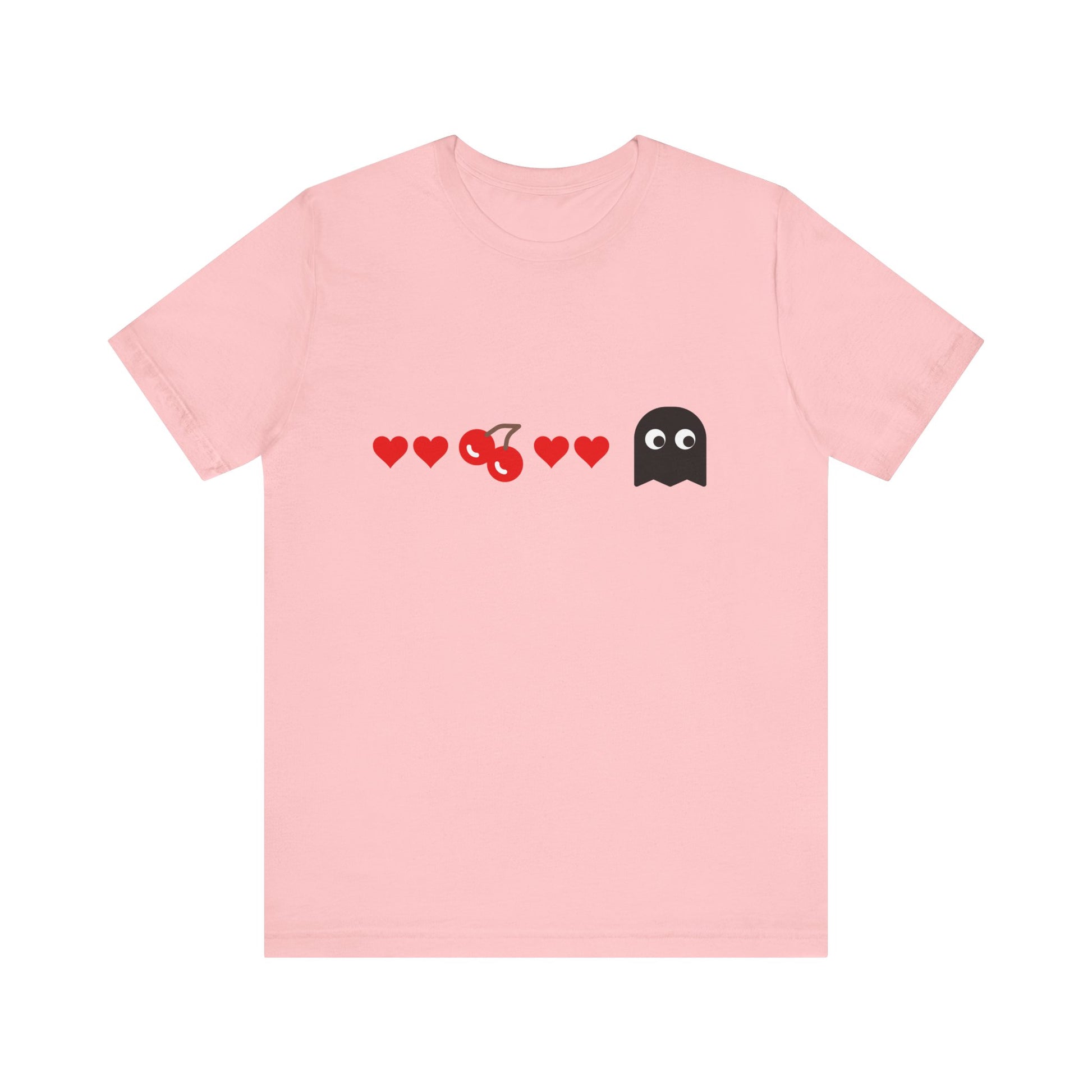 Couples Pacman Ghosts Hearts Valentines Video Game Tee. This Couples Pac man Ghosts Hearts Valentines video gaming classic unisex jersey short sleeve tee fits like a well-loved favorite. Soft cotton and quality print make users fall in love with it over and over again. These Couples pacman Ghosts Hearts Valentines gaming t-shirts have-ribbed knit collars to bolster shaping. The shoulders are tapered for a better fit over time. Dual side seams hold the garment's shape for longer.