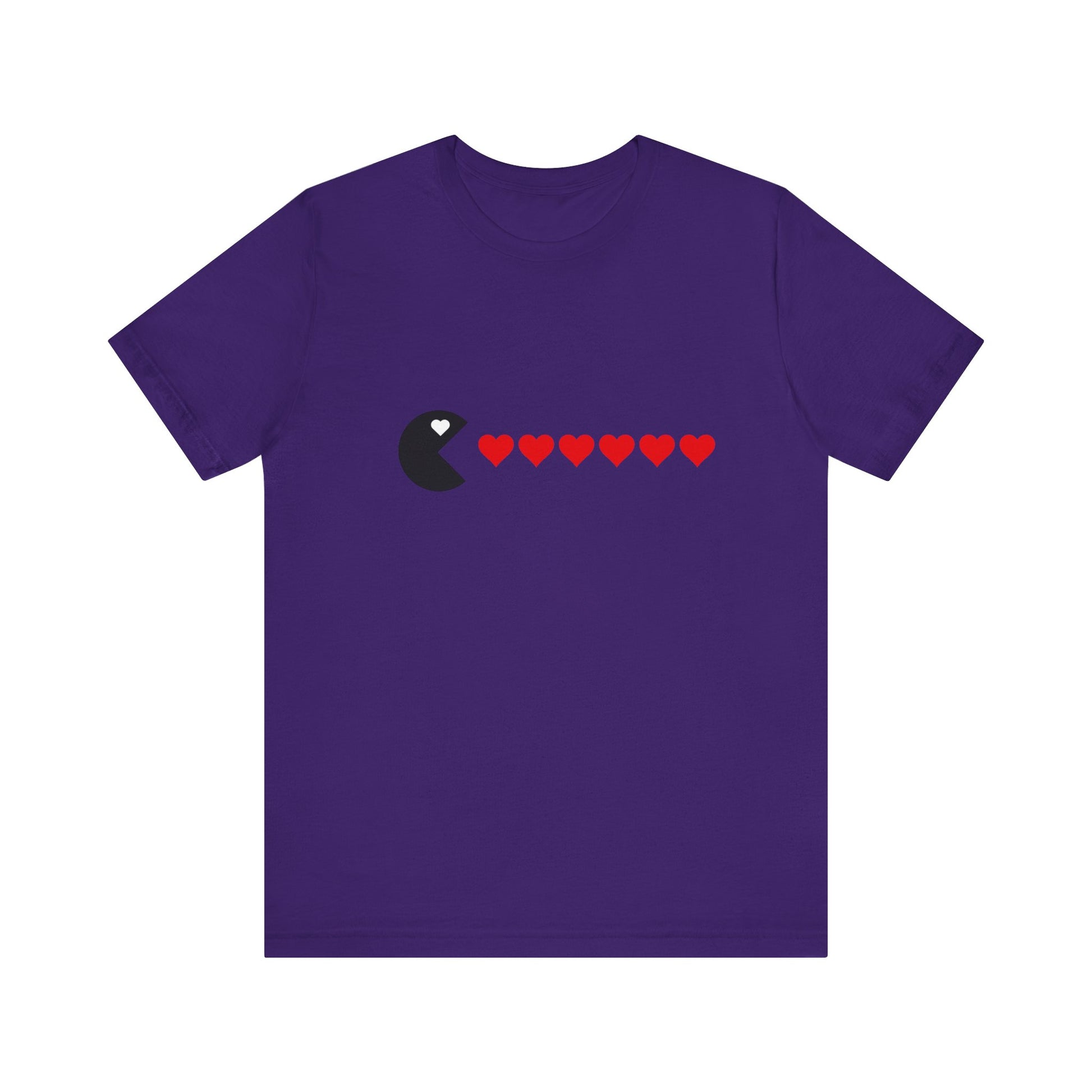 Couples Pacman Hearts Valentines Video Game Tee. This Couples Pac man Love Hearts Valentine gaming classic unisex jersey short sleeve tee fits like a well-loved favorite. Soft cotton and quality print make users fall in love with it over and over again. These Couples Pacman Hearts Valentines lovers video games t-shirts have-ribbed knit collars to bolster shaping. The shoulders are tapered for a better fit over time. Dual side seams hold the garment's shape for longer.