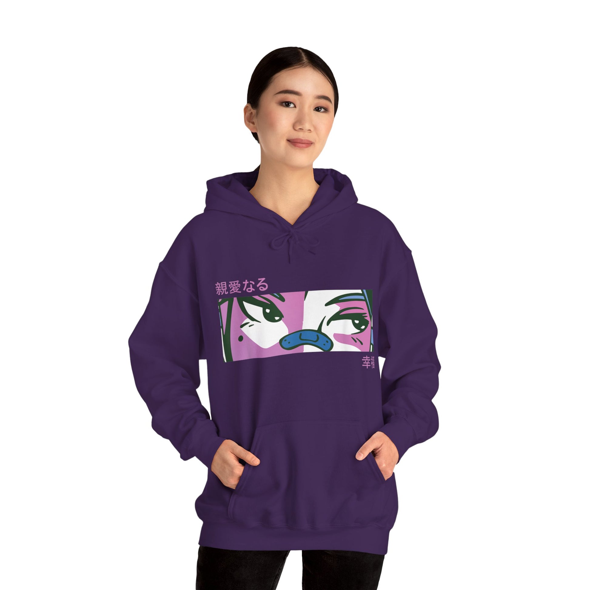 This purple colored japanese unisex heavy blend hooded sweatshirt is relaxation itself. Made with a thick blend of cotton and polyester, it feels plush, soft and warm, a perfect choice for any cold day. In the front, the spacious kangaroo pocket adds daily practicality while the hood's drawstring is the same color as the base sweater for extra style points. Cartoon Hooded Sweatshirt for anime fans. Otaku fan hoodies for otakus.